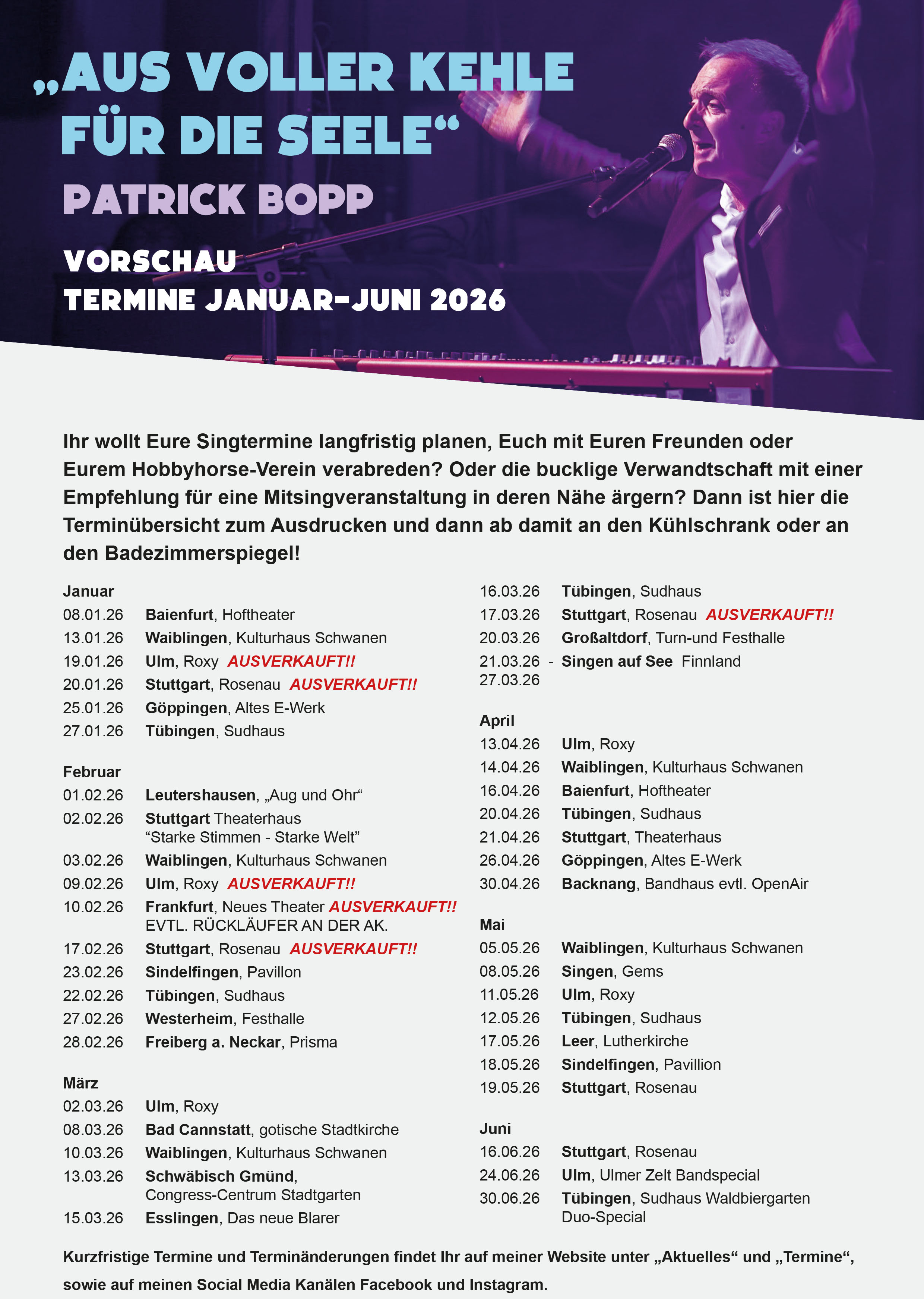 Das erste Mal in diesem Jahr wird am 23.02.26 im Pavillon in Sindelfingen gesungen. Nachdem auch hier die letzte Veranstaltung ausverkauft war und wir wieder den für diesen Ort typischen direkten Sound genießen konnten, freue ich mich sehr auf Euch, Eure Stimmen und Eure Stimmung! INFO UND TICKETS