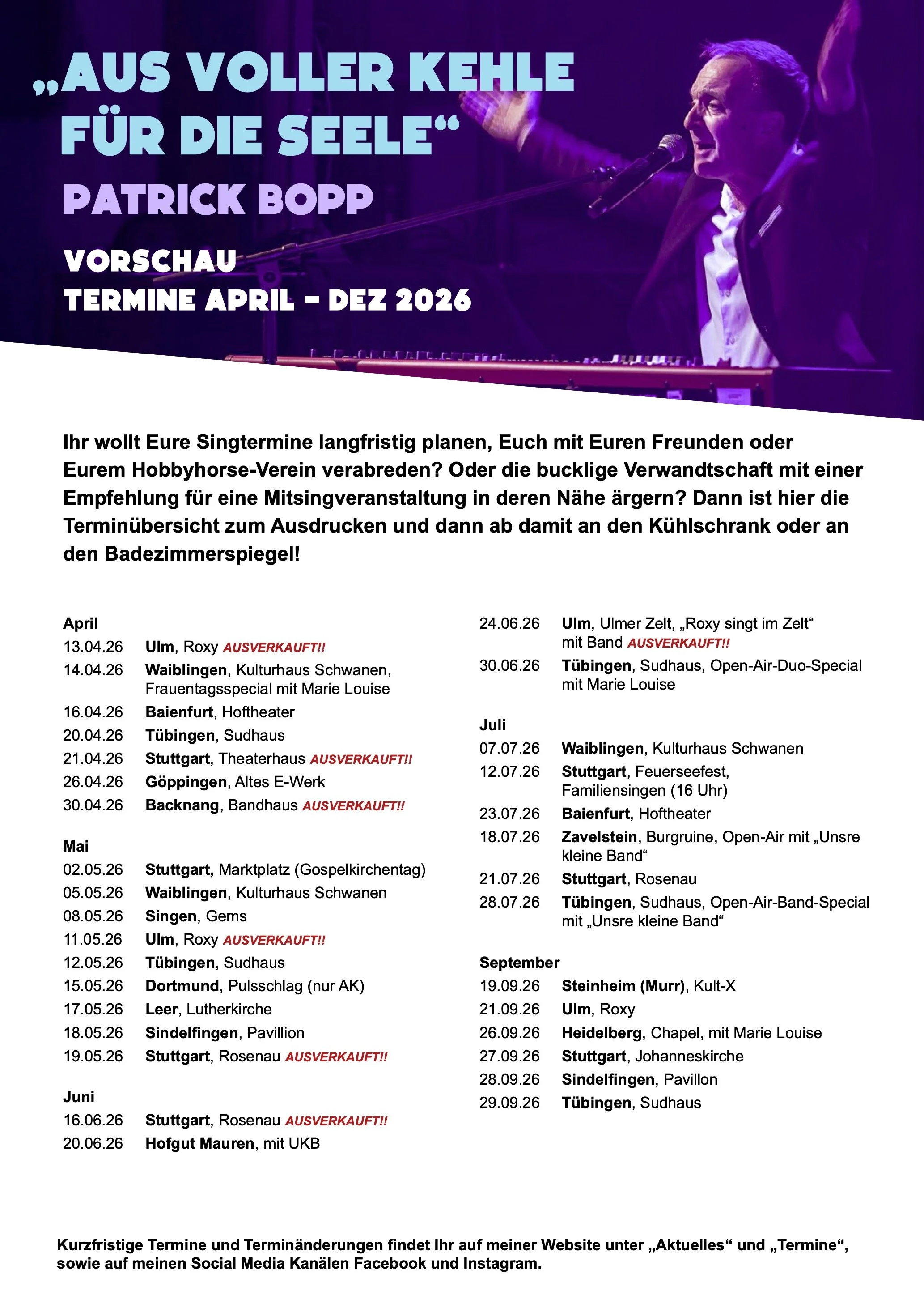 Hier noch zwei Hinweise: Für die Stuttgarter, die keine Karten mehr für das Theaterhaus oder die Rosenau bekommen haben, gibt es am 02.05.26 ab 11 Uhr die Möglichkeit auf dem Stuttgarter Marktplatz mit mir zu singen. Das findet zwar im Rahmen des Gospelkirchentages statt, aber das heißt ja nicht, dass da Gospel gesungen werden müssen, die werden an anderer Stelle ja dann noch zur Genüge erklingen…:)
